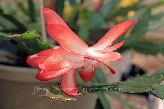 I went in the greenhouse this afternoon to water the plants. I noticed that my Christmas Cacti's were loaded with new growth. Then, I noticed that one of them had a flower on it.