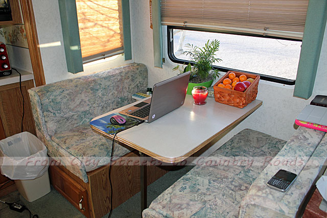 Hubby & I lived in a tiny trailer while building our house. We had bench seats like yours, and the storage space under my seat stored all of my art & craft supplies, my Featherweight sewing machine & a big bag of fabric. :)